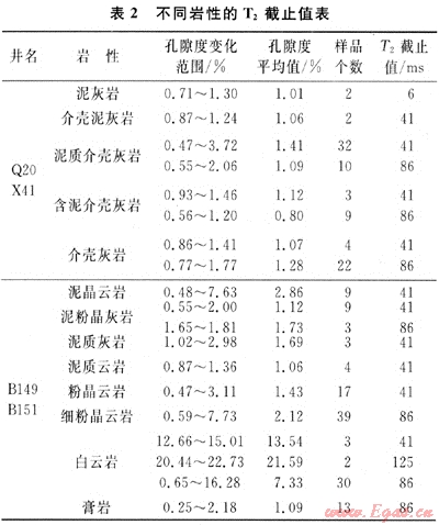 通過對216塊巖樣的T2截止值實驗,結(jié)果表明:孔隙度大小對R截止值影響沒有明顯的規(guī)律,泥質(zhì)含量高低與T2截止值有一定的統(tǒng)計規(guī)律,一般情況下,泥質(zhì)含量高的碳酸鹽巖的T2截止值一般較小(表2),普遍在41ms左右;而泥質(zhì)含量低,巖性較純的碳酸鹽巖的T2截止值普遍較泥質(zhì)含量高的巖樣的T2截止值高,在86ms左右。因此碳酸鹽巖地層核磁共振測井的T2截止值不應是定值,它與泥質(zhì)含量成反比關(guān)系[6]。