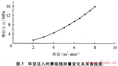 2) 環(huán)空注入。環(huán)空注入壓裂是在地層破裂后通過油管、套管環(huán)空注入攜砂液進(jìn)行后續(xù)作業(yè),同時(shí)降低(或關(guān)閉)連續(xù)油管排量進(jìn)行井底壓力檢測。環(huán)形空間的流動通道遠(yuǎn)遠(yuǎn)大于連續(xù)油管,同時(shí)由于攜砂液不再流經(jīng)噴嘴而不存在節(jié)流摩阻,從而大大降低了摩阻損失,具體計(jì)算結(jié)果見圖3。即使排量為8m3/min,3000m管柱環(huán)空摩阻也僅為16MPa左右,排量較低時(shí)基本可以忽略摩阻影響,這為大排量施工奠定了基礎(chǔ)。