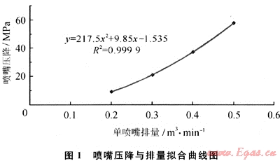 (式中Q為排量;A為過流面積)。因此,對試驗(yàn)測定結(jié)果進(jìn)行平方擬合即可得到噴嘴壓降與排量的關(guān)系,對常用Ø6mm噴嘴進(jìn)行擬合(圖1)得到如下關(guān)系式: