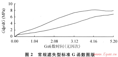 對(duì)于每一個(gè)時(shí)間t都有一個(gè)與之對(duì)應(yīng)的地面壓力,在求出相應(yīng)的G函數(shù)同時(shí),可采用一階差分?jǐn)?shù)值計(jì)算方法,求出對(duì)應(yīng)的dp/dG。為便于分析,從數(shù)學(xué)意義上將G函數(shù)和一階差分計(jì)算結(jié)果dp/dG相乘,構(gòu)造了疊加導(dǎo)函數(shù)Gdp/dG。以dp/dG、Gdp/dG為縱軸,以G為橫軸,得出G函數(shù)導(dǎo)數(shù)分析曲線。