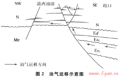 港西地區(qū)斷層發(fā)育,新近系和古近系又是不整合接觸,這為港西凸起的淺層氣從深層往上運(yùn)移創(chuàng)造了很好的條件(圖2),而且當(dāng)斷層切過深部油藏時(shí),地層壓力驟然下降,天然氣會不斷地從石油中析出,沿著斷層向上運(yùn)移,形成純氣藏或氣頂。