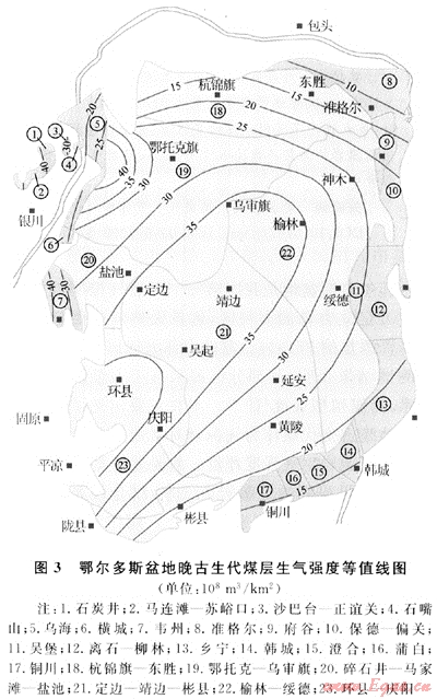 盆地東北部由于抬升幅度較大,煤系的熱演化后來處于停滯狀態(tài),準(zhǔn)格爾煤的生氣強(qiáng)度在10×108m3/km2左右;府谷-韓城北在20×108m3/km2左右;西緣逆沖帶上盤煤的熱演化程度只達(dá)到長焰煤-氣煤階段,烏海-橫城煤的生氣強(qiáng)度在20×108m3/km2左右,而下盤因長期的深埋,煤的變質(zhì)程度達(dá)到貧煤和無煙煤階段,存在一個(gè)局部高值區(qū)(30×108~40×108m3/km2);石嘴山、石炭井、沙巴臺-正誼關(guān)煤的生氣強(qiáng)度超過30×108m3/km2,由東向西增大,馬連灘-蘇峪口達(dá)40×108m3/km2。在盆地中深部,杭錦旗-東勝煤的生氣強(qiáng)度多為15×108m3/km2,鄂托克烏審旗為(25~35)×108m3/km2;鹽池-環(huán)縣一帶存在一個(gè)煤層厚度大于10m的富煤帶,Rmax為2.5%左右,生氣強(qiáng)度為(30~45)×108m3/km2;靖邊-彬縣煤層厚度小于5m,生氣強(qiáng)度為20×108m3/km2左右,榆林-綏德煤層厚度超過10m,生氣強(qiáng)度約為30×108m3/km2。