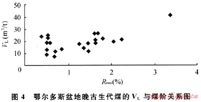 煤階是影響煤對甲烷吸附能力最為重要的因素。Kaiser等[18]認(rèn)為,在煤化作用階段早期,煤中發(fā)育的孔隙主要為原生大孔隙且含有大量的羥基和羧基官能團(tuán),此時(shí)煤親水而疏甲烷,造成平衡水分含量非常高,但吸附能力較低,隨煤階增高,原生大孔隙急劇減少,熱變氣孔逐漸增多,羥基和羧基官能團(tuán)大量脫落,使得煤的親甲烷能力顯著增加,同時(shí)熱變氣孔的大量形成,為甲烷吸附提供了空間[18~19],所以高煤級煤對甲烷的吸附能力一般強(qiáng)于低煤級煤。盆地晚古生代煤的VL隨熱成熟度提高呈“U”型趨勢變化(見圖4),當(dāng)0.40%<Rmax<0.80%時(shí),隨煤階增大,煤對甲烷的吸附能力迅速下降,以Rmax=0.8%為臨界點(diǎn),在0.8%<Rmax<4.0%時(shí),最大吸附氣量隨煤階增大而增加。由于盆地中深部目前沒有實(shí)測的VL數(shù)據(jù),參考盆地邊淺部煤的U在0.8%<Rmax<4.0%區(qū)間內(nèi)隨煤階的變化規(guī)律,筆者根據(jù)中深部煤的熱成熟度分布特點(diǎn)對煤的最大吸附能力進(jìn)行了推測,并結(jié)合現(xiàn)存煤炭資源量推算出全盆地中深部晚古生代煤對甲烷的理論吸附氣量為51.92×1012m3。