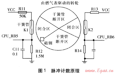 目前我國的IC卡燃氣表均采用脈沖計數(shù)方式,即在原基表機械計數(shù)器上加裝脈沖傳感裝置如干簧管、霍爾元件等,產(chǎn)生脈沖輸出,電子控制器對采集到的脈沖進行累計和換算,獲得數(shù)據(jù)。目前廣泛使用干簧管計數(shù),脈沖計數(shù)原理見圖1。