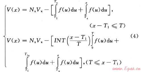 式中V(x)為任意時(shí)刻LNG接收站庫存水平,m3;Nx為LNG運(yùn)輸船量,m3;T1為第一次運(yùn)輸船卸船開始時(shí)刻;Ts為所求時(shí)刻所屬“季節(jié)”期起始時(shí)刻;T1z為第一次運(yùn)輸船卸船開始時(shí)刻所屬季節(jié)期的終止時(shí)刻。