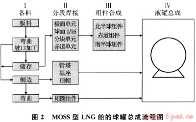 MOSS型LNG船的球罐采用鋁合金制成,板材的厚度按照不同的部位大致取值在30~170nm。為達(dá)到理想的保溫作用,鋁合金球的外表覆蓋著一層厚厚的泡沫絕緣材料,同時(shí)為了保護(hù)絕緣材料,整個(gè)貨艙球的最外表面是保護(hù)型金屬外殼。大型球罐的制造工藝流程分為備材、分段焊接、組件合成和液罐總成4個(gè)部分,詳見(jiàn)圖2。