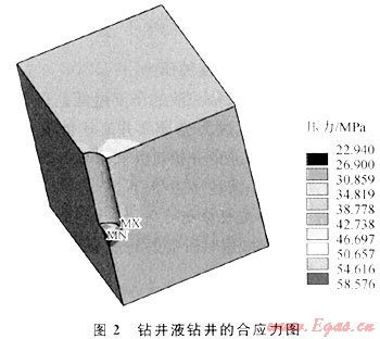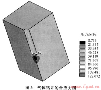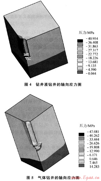 用ANSYS有限元軟件模擬了井深3000m鉆井液鉆井和氣體鉆井的地層地應(yīng)力(規(guī)定拉應(yīng)力為正,壓應(yīng)力為負(fù)),從圖2、3可以看出,氣體鉆井時井底巖石應(yīng)力值比鉆井液鉆井時井底巖石的應(yīng)力值要小很多,比如圖3中氣體鉆井時井底巖石的應(yīng)力最小值只有8.756MPa,而鉆井液鉆井時,井底巖石的應(yīng)力最小值約22.94MPa。根據(jù)第四強度理論得到的氣體鉆井時井底巖石是處于低應(yīng)力狀態(tài),此條件下的巖石的強度和塑性均比較小,比較容易破壞。從圖4、5分析垂直于井底方向的應(yīng)力,鉆井液鉆井時井底為壓應(yīng)力,氣體鉆井時,井底巖石受到沿井眼軸向向上的拉應(yīng)力,井底中心的拉應(yīng)力大小為14.28MPa,逐漸向外圍擴大,井壁處的拉應(yīng)力為0.647MPa。這拉應(yīng)力有“拉斷巖石,使井底巖石跳離井底”的趨勢。