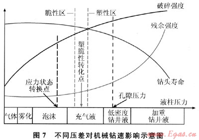巖石的破碎強度是隨圍壓的變化而改變的。巖石強度極限隨著圍壓的增大而增大,只是不同巖石種類有不同的增長速率。鉆井過程中,鉆井液密度越大,井底液柱壓力就越大,巖石的破碎強度就越大,地層就越難破碎;反之相反。因此,在鉆井中盡可能減少井底壓力有利于降低巖石強度、提高鉆速。而降低井底液柱壓力的極限狀態(tài)就是氣體鉆井。