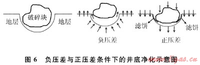 對滲透性地層,地層內(nèi)飽和的流體可以流動(圖6)。負(fù)壓差條件下向外流動的流體將破碎巖屑浮起,推離井底,避免了重復(fù)破碎和產(chǎn)生更多的微粒。在正壓差條件下,正壓差下向地層內(nèi)的滲流失水,首先將巖屑壓在井底,之后迅速形成淺層濾餅,不但將巖屑緊緊壓在井底,造成巖屑的二次破碎,而且造成液柱壓力與孔隙壓力之差值集中作用于井底薄層,形成該層的集中應(yīng)力。