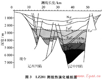 遼東灣地區(qū)有多個次級構(gòu)造帶,各凹陷烴源巖的演化程度有較大差異。為了進一步揭示和刻畫其演化差異,在單井模擬的基礎之上,結(jié)合以往研究成果,從該區(qū)選擇了10條二維剖面(圖1),應用EASY%Ro模型進行埋藏史、熱史和成熟度演化史模擬。以測線LZ281剖面成熟度演化史模擬為例(圖3),模擬結(jié)果表明:整體來看,對于同一層位來說,與遼中凹陷相比,遼西凹陷的熱演化程度較低。遼東灣的生烴門限約為深度2500m(Ro>0.5%),遼中凹陷東二下段和遼西凹陷的東三段烴源巖進入生烴門限。遼東灣地區(qū)的排烴高峰(0.8%<Ro<1.0%)為深度3400~3600m,遼中凹陷東三段下部及沙一、二段烴源巖和遼西凹陷沙三段烴源巖處于排烴高峰階段,產(chǎn)生大量液態(tài)烴。深度超過4400m處,遼中凹陷大部分沙三段烴源巖進入高成熟階段(Ro>1.3%),以生成凝析氣、濕氣為主;沙四段烴源巖Ro>2.0%,進入過成熟階段??梢?,現(xiàn)今遼西凹陷東三段-沙三段主力烴源巖主要處于生、排烴高峰,生成大量油氣,是目前遼西凹陷及其周圍地區(qū)內(nèi)一系列大中型油氣田發(fā)現(xiàn)的物質(zhì)基礎;而遼中凹陷熱演化程度較高,除東下段和沙一二段烴源巖還處于生油階段,沙三段烴源巖主要處于生氣階段,是遼中凹陷和遼西低凸起發(fā)現(xiàn)大規(guī)模凝析氣田和油田的物質(zhì)基礎。