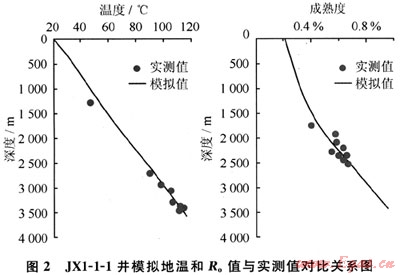 筆者對JX1-1-1、JZ25-1-3等10口井進行熱史模擬,并利用溫度和實測鏡質(zhì)體反射率進行標定。模擬的地溫隨深度的變化趨勢和鏡質(zhì)體反射率值,均與實測值的擬合關系較好(圖2),表明利用古熱流法恢復遼東灣地區(qū)的熱史是可行的。