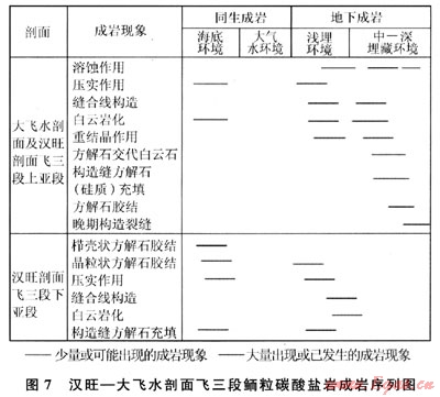 從成巖序列來看,川西坳陷北段南部與南段的成巖作用有明顯的差異,北段南部以海底成巖、淺埋成巖作用為主,而南段大飛水剖面以埋藏成巖作用為主,中、深埋藏成巖作用顯著??傮w上,飛三段成巖作用在平面上由北向南,成巖作用由海底向埋藏成巖變化。北段南部(如漢旺剖面下亞段)經(jīng)歷了明顯的海底成巖作用,纖維狀等厚環(huán)邊、粒狀方解石膠結(jié)普遍發(fā)育,這使原始粒間孔隙顯著減小。在埋藏成巖環(huán)境中,壓實(shí)、壓溶和膠結(jié)作用使孔隙度進(jìn)一步降低,而鮞粒內(nèi)及沿縫合線分布的白云巖化作用,對孔隙度影響較小,使最終孔隙度很低。漢旺剖面上亞段和南段(大飛水剖面)的成巖作用相似,埋藏期的壓實(shí)作用較強(qiáng)烈,白云巖化可能均為埋藏成因,重結(jié)晶現(xiàn)象較強(qiáng)烈且未發(fā)現(xiàn)同生成巖期大氣水溶蝕作用形成的鮞粒鑄模孔,表明可能與埋藏溶蝕作用有關(guān),中-晚期溶蝕作用是孔隙發(fā)育的重要因素。