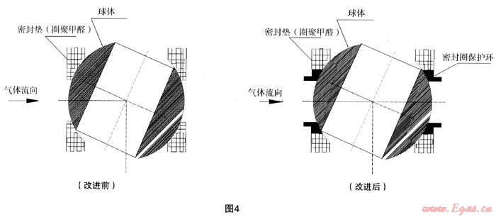 針對以上的原因及現(xiàn)象,結(jié)合液壓子站工作特點(diǎn)研究認(rèn)為:閥門內(nèi)漏原因和密封圈損壞現(xiàn)象提出,如果在氣動(dòng)球閥內(nèi)加一保護(hù)密封圈裝置,避免密封圈直接與雜質(zhì)、高溫氣液、液壓沖擊接觸,此問題就可得到較好的解決。改進(jìn)前后詳見圖4。