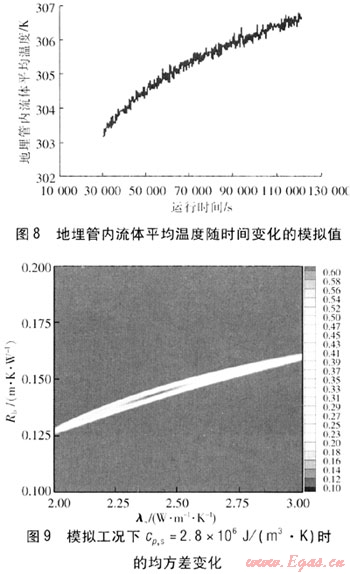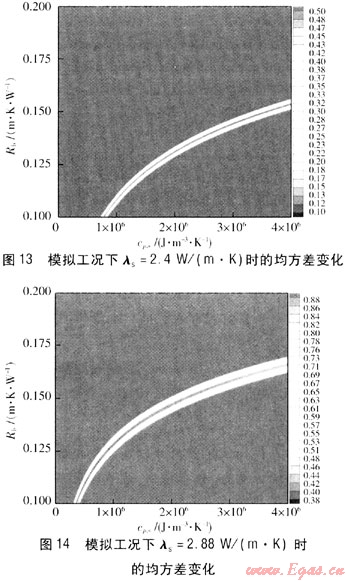 由圖2~4、9~11可知,均方差最小值的區(qū)域基本固定,其對應(yīng)的λs在2.4W/(m·K)左右。因此,可以得出結(jié)論,在實(shí)際過程中即使存在一些不確定因素的影響,得到的模擬值與理論值存在一定的偏差,但是經(jīng)過參數(shù)估計處理得到cp,s的變化對結(jié)果的影響也很小,cp,s偏差±12.5%對λs的影響在±2%左右。通常情況下cp,s的獲得可以依據(jù)現(xiàn)場鉆孔中心巖土分析來確定,相對誤差一般在±5%以內(nèi),對λs的影響更小。