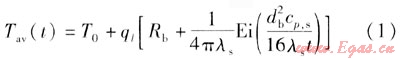 地埋管換熱器的傳熱模型主要有線熱源模型、柱熱源模型。線熱源模型是基于1948年Ingersoll和Plass等人發(fā)展的Kelvin線熱源理論[8]。工程上常見的地埋管換熱器的直徑一般為26~36mm,鉆孔深度為40~200m,與鉆孔深度相比,地埋管的直徑很小。在地埋管換熱器工作時,相當(dāng)于在半無限大介質(zhì)中,鉆孔中心的一根線熱源與周圍巖土進(jìn)行熱交換。另外,假設(shè)沿地埋管長度方向傳熱量忽略不計,周圍巖土均勻且線熱源與巖土的傳熱量恒定。由于該方法不受具體換熱器形式的限制,計算較簡單,且能滿足一般工程中土壤源熱泵系統(tǒng)設(shè)計計算的要求,具有較廣泛的實(shí)用性。根據(jù)假設(shè),可以得到地埋管內(nèi)流體平均溫度與鉆孔周圍巖土初始平均溫度及其他參數(shù)之間的關(guān)系式[9]:
