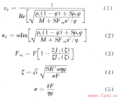 式中:S為飽和度;J0為零階貝塞爾函數(shù);J1為一階貝塞爾函數(shù);ρs為固體密度;φ為孔隙度;ρf為流體密度;M為干噪骨架的單軸應(yīng)變模量;Fsq為固-流耦合系統(tǒng)的綜合壓縮性;α為有效應(yīng)力孔隙彈性系數(shù);R為特征噴射流動長度;ω為圓頻率;η為流體黏滯度;k為滲透率;F為固-流耦合系統(tǒng)的壓縮性;κ為干噪骨架體積模量。