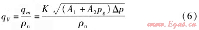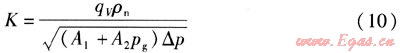 將數(shù)據(jù)qV=3000m3/h,ρn=1.293kg/m3,A1=1.189,A2=0.0119,pg=5kPa,△p=0.7437 kPa代入式(10),可求得:K=4025.5293。