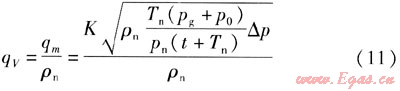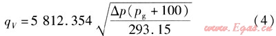 將數(shù)據(jù)qV=3000m3/h,ρn=1.293kg/m3,L=273.15K,pg=5kPa,p0=100kPa,pn=101.32kPa,t=20℃,△p=0.74377kPa代入式(12),可求得:K=4025.3021。