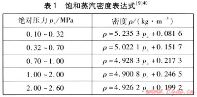 飽和蒸汽不同于理想氣體,不能通過氣體狀態(tài)方程來計算其密度;也不同于過熱蒸汽,不能用以溫度和壓力為自變量的近似公式來計算其密度;只能用以溫度或壓力為自變量的近似公式來計算其密度。以壓力為函數(shù)的飽和蒸汽密度表達式見表1,飽和蒸汽密度表達式在相應的壓力范圍內精度比較高。