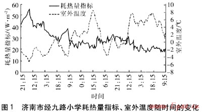 以濟南市經九路小學為例,測試日期為2010年1月20日至28日,耗熱量指標、室外溫度隨時間的變化見圖1。