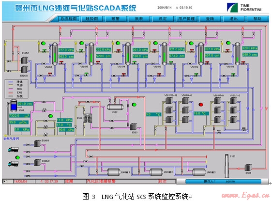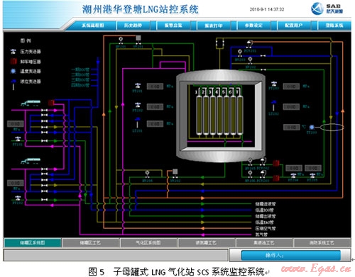 SAE-LSMS系統(tǒng)已成功在國內(nèi)應(yīng)用多年,2005年深圳美視電廠總管式增壓40kfg,氣化量48,000NM3/H,2007年深圳燃?xì)饧瘓F梅林LNG應(yīng)急調(diào)峰站單元式增壓20kfg,氣化量小時40,000NM3/H,2008年南京港華兩個2500立方LNG子母罐氣化站均已應(yīng)用該系統(tǒng)。均取得了較好的效果。圖5為廣東潮州子母罐式LNG氣化站SCS系統(tǒng)監(jiān)控畫面。