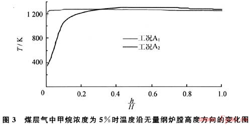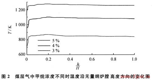 在3種工況條件下,h/H大于0.05時(shí)爐膛溫度均大于840K,而甲烷的著火溫度為811K。當(dāng)爐膛的溫度大于甲烷的著火溫度時(shí)就可以維持燃燒,這說明在煤層氣中甲烷濃度不低于3%時(shí),利用流態(tài)化蓄熱裝置可以維持燃燒。對計(jì)算區(qū)域溫度取平均值并定義為爐膛的平均溫度,當(dāng)煤層氣中甲烷濃度為5%、4%、3%時(shí),爐膛的平均溫度分別為1256K、1080K、842K。煤層氣中甲烷濃度由5%下降到4%時(shí),爐膛平均溫度下降,溫度下降值△T1為176K;煤層氣中甲烷濃度由4%下降到3%時(shí)溫度下降值△T2為238K??梢姡S著煤層氣中甲烷濃度的下降,溫度降低,并且下降幅度有增大趨勢,可以判斷,當(dāng)煤層氣中甲烷濃度低于3%時(shí),爐膛溫度迅速降低并低于甲烷的著火溫度811K,無法維持煤層氣在爐膛中的燃燒,這和數(shù)值模擬中當(dāng)煤層氣中甲烷濃度低于3%時(shí)不能燃燒的計(jì)算結(jié)果是一致的。所以流化床蓄熱裝置燃燒超低濃度煤層氣的著火極限濃度為3%。