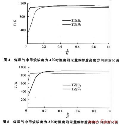 圖3~5分別為煤層氣中甲烷在同一濃度時(shí),蓄熱燃燒和絕熱燃燒兩種不同條件下,爐膛溫度沿高度方向的變化圖示。從圖中可以看出,工況A2、B2、C2為絕熱燃燒,由于采用煤層氣和空氣的混合物常溫進(jìn)入爐膛,在爐膛入口出溫度較低,并隨著高度的增加,溫度逐漸升高,溫度最高點(diǎn)出現(xiàn)在h/H為0.4附近。工況A1、B1、C1采用石英砂蓄熱顆粒,由于石英砂顆粒的存在,使得h/H小于0.2的底部區(qū)域溫度比絕熱燃燒時(shí)溫度高,最高溫度點(diǎn)出現(xiàn)在矗/H為0.2附近。圖3為煤層氣中甲烷濃度為5%時(shí),工況A1和A2溫度變化的情況,最高溫差△T3為30K。圖4為煤層氣中甲烷濃度為4%時(shí),工況B1和B2溫度變化的情況,最高溫差△T4為41K。圖5為煤層氣中甲烷濃度為3%時(shí),工況C1和C2溫度變化的情況,最高溫差△T5為52K。可見,隨著煤層氣中甲烷濃度的增加,絕熱燃燒與蓄熱燃燒的最高溫差逐漸減少。