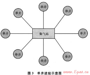 單井進站即每口氣井分別通過各自獨立的采氣管線直接進站,其單井進站示意圖如圖3。此方式是目前在常規(guī)天然氣氣田中應(yīng)用最廣的模式,如長慶氣田、川渝氣田大都采用了單井直接進站的方式。這種進站方式的特點是氣井間相互影響小,適合于高壓高產(chǎn)的單井,但采氣管網(wǎng)距離最長,建設(shè)工程量大,因此,這種方式對于產(chǎn)氣量低、井距小、壓力低且處于山區(qū)復(fù)雜條件下的煤層氣井并不適用。