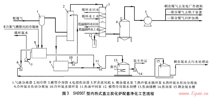 SH2007型內(nèi)熱式直立炭化爐配套的煤氣凈化工段采用間一直冷相結(jié)合的工藝,流程見圖3。從爐頂來的80℃左右的粗煤氣,經(jīng)氣液分離器,進(jìn)入初冷塔底部。冷卻后的煤氣從初冷塔上部進(jìn)入橫管冷卻器上段,用循環(huán)水冷卻至40~45℃;再進(jìn)入橫管冷卻器下段,用低溫循環(huán)水冷卻至25~30℃。再進(jìn)入電捕焦油器,脫除焦油霧后的煤氣用羅茨鼓風(fēng)機(jī)加壓。一部分回直立炭化爐供爐體加熱;一部分送至刮焦機(jī)端部的烘干裝置,與空氣混合燃燒烘干半焦;剩余煤氣送往發(fā)電廠作為燃料。