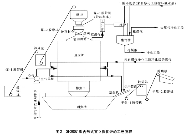 我公司于2005年抽調(diào)部分專業(yè)設(shè)計(jì)人員在總結(jié)國內(nèi)外內(nèi)熱式直立炭化爐生產(chǎn)操作經(jīng)驗(yàn)的基礎(chǔ)上,對(duì)如何提高其產(chǎn)能進(jìn)行了專項(xiàng)研究。于2007年開發(fā)出了年產(chǎn)10×104t的爐型,命名為SH2007型內(nèi)熱式直立炭化爐。2007年8月,由神木縣大柳塔華盛機(jī)制蘭炭廠首家投資建設(shè)的第一座SH2007型內(nèi)熱式直立炭化爐正式開工。2008年9月順利投產(chǎn),截至目前運(yùn)行良好,并取得較高經(jīng)濟(jì)效益,得到該公司的認(rèn)可和好評(píng)。實(shí)踐證明,該爐型主要技術(shù)指標(biāo)均達(dá)到了設(shè)計(jì)要求,在保證產(chǎn)品質(zhì)量的同時(shí)其生產(chǎn)能力最高可達(dá)到12×104t/a,是內(nèi)熱式直立炭化爐產(chǎn)能的新突破。下面以神木縣大柳塔華盛機(jī)制蘭炭廠的SH2007型內(nèi)熱式直立炭化爐為例,對(duì)其生產(chǎn)工藝、配套的煤氣凈化工藝等進(jìn)行介紹。