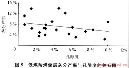 霍林河地區(qū)煤熱演化程度低,還沒有達(dá)到大量生烴階段,煤層氣組分以生物氣為主,含少量煤熱解氣(圖4)。從煤巖煤質(zhì)上看,霍林河地區(qū)煤層鏡質(zhì)組含量高,對煤層氣成藏有利。金振奎等通過沁水盆地分析了灰分產(chǎn)率對煤儲層性能的影響,認(rèn)為無機物一般充填于煤孔隙及裂隙[10],占據(jù)孔裂隙空間。并根據(jù)之間的關(guān)系統(tǒng)計,得出灰分產(chǎn)率與孔隙度之間呈線性負(fù)相關(guān)。本次研究用低煤階樣品也得出同樣的關(guān)系(圖5):即灰分產(chǎn)率越高,孔隙度越低。低煤階煤層氣氣運移通道主要以孔隙型為主。因此對于低煤階煤儲層,灰分含量對煤儲層滲透性有較大影響,灰分越大,煤儲層滲透性越差。