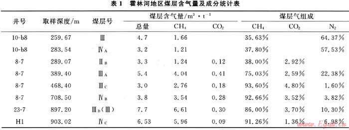 本區(qū)煤層含氣量的資料不多,從部分煤炭鉆孔中取樣測試得到的含氣量最高達(dá)到了7.7m3/t(如表1)。煤層氣井H1井煤樣測試含氣量為2.08~6.53m3/t,煤層甲烷平均含量為91.47%,總體隨埋藏深度的增加,煤層含氣量與甲烷含量均增加。