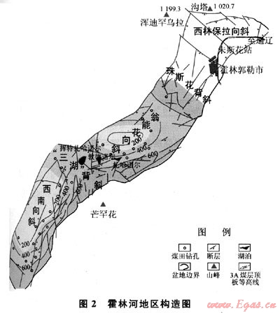 霍林河盆地位于大興安嶺南段,距通遼市西北400km,為一北東向展布的半地塹型斷陷盆地,面積540km2(圖1)。區(qū)內(nèi)煤炭資源豐富,以低煤階褐煤為主。構(gòu)造總體為一不對稱的寬緩向斜,兩翼傾角比較平緩,東翼傾角小于10°,西翼傾角12°~15°。盆地發(fā)育次級褶皺,自北往南依次為:西林保拉向斜、珠斯花背斜、翁能花向斜、“三湖”背斜、西南向斜,盆地呈“三洼二隆”的格局(圖2)。該區(qū)主要發(fā)育北東和北西向高角度正斷層,其中盆地西緣F1為同生斷層,控制盆內(nèi)煤層的發(fā)育,構(gòu)造總體屬簡單中等。自20世紀(jì)70年代開始,在該區(qū)主要進(jìn)行了煤炭的勘探與開發(fā)工作,2007年中國石油天然氣股份有限公司在中部洼陷鉆探一口煤層氣井,排采試驗獲得工業(yè)氣流。