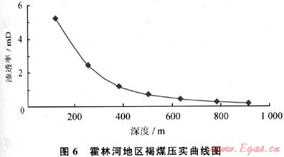 煤層氣勘探試驗注入、壓降測試煤層埋深900m,煤層滲透率為0.91mD。對煤層進(jìn)行壓實曲線分析表明(圖6):煤層埋深100~500m,每增加100m,滲透率降低2.1mD;而在埋深500~900m,埋深每增加100m,滲透率降低0.1mD。說明埋藏早期以大孔隙壓實為主,后期以微孔隙壓實為主。總體本區(qū)煤儲層物性好,滲透性較高,淺部煤層滲透率將更高。