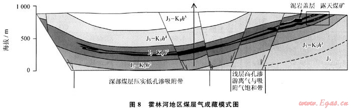 霍林河地區(qū)地下水環(huán)境較好,地下水為HCO3-Ca型和HCO3-Na-Ca型,礦化度低,淺層單斜緩坡容易形成生物氣補給;淺層孔滲性好,深部煤層氣向上運移,淺部如蓋層條件好則在高部位富集成藏形成游離氣與吸附氣復(fù)式氣藏(圖8)。