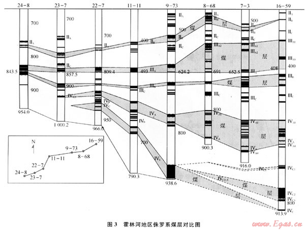 下含煤段分為Ⅰ、Ⅱ、Ⅲ、Ⅳ共4個煤組,煤層厚度巨大,可采煤層平均總厚度76.91m。該區(qū)存在2個富煤中心,分別位于煤盆北部的翁能花向斜和南部的西南向斜。煤層層數(shù)多,但煤層沿走向、傾向的分岔(變薄、尖滅)明顯(圖3),該區(qū)煤層氣勘探的主力層位為ⅡB、ⅢA、ⅢB、ⅣC?;袅趾拥貐^(qū)煤層的埋藏深度大多淺于1000m,只在向斜軸部煤層埋藏深度大,煤層總體沿盆地東南邊緣向盆地中心,其埋深逐漸增大。滕玉洪等根據(jù)煤田做的瓦斯含量解析資料的計算結(jié)果,霍林河地區(qū)甲烷風(fēng)化帶的埋藏深度為416.8m[9]。因此煤層氣勘探的深度為400~1000m。