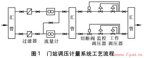 天然氣門站是城市天然氣輸配系統(tǒng)的氣源點(diǎn),應(yīng)具備過(guò)濾、調(diào)壓、計(jì)量、安全切斷、運(yùn)行路和備用路自動(dòng)切換等主要功能,確保供氣的連續(xù)性、安全性和穩(wěn)定性。為保證天然氣門站供氣的可靠性,在其計(jì)量單元和調(diào)壓?jiǎn)卧O(shè)有備用路[4]。門站調(diào)壓計(jì)量系統(tǒng)工藝流程見圖1。