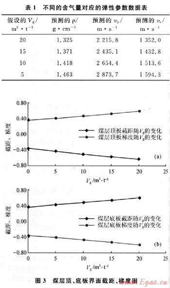 建立地質(zhì)模型:煤層頂板、煤層、煤層底板等3層。通過數(shù)據(jù)統(tǒng)計分析確定煤層頂、底板泥巖彈性參數(shù):vp=3995.9m/s、vs=2048m/s、ρ=2.55g/cm3,煤儲層的彈性參數(shù)可通過3個轉化關系式計算獲得。假設vg從20m3/t變化到0,根據(jù)3個轉化關系式計算出相應的煤層氣儲層彈性參數(shù)(表1),將計算的彈性參數(shù)代入Shuey簡化公式[7],求得與假設的各個Vg值相對應的截距和梯度屬性(圖3)。