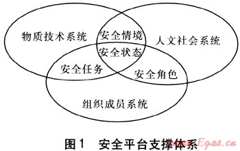 物質(zhì)技術(shù)系統(tǒng)、人文社會系統(tǒng)和組織成員系統(tǒng)3個集合的交叉構(gòu)成了3種聯(lián)系,形成安全情境、安全任務(wù)、安全角色和安全狀態(tài)4個交集。其中物質(zhì)技術(shù)系統(tǒng)與人文社會系統(tǒng)的交集構(gòu)成了管道燃氣企業(yè)所處的軟環(huán)境和硬環(huán)境,稱為安全情境。人文社會系統(tǒng)與組織成員系統(tǒng)的交集決定了管道燃氣企業(yè)中員工在安全生產(chǎn)中的身份,稱為安全角色。物質(zhì)技術(shù)系統(tǒng)與組織成員系統(tǒng)的交集劃定了組織成員在生產(chǎn)中所擔(dān)負的責(zé)任,稱為安傘任務(wù)。物質(zhì)技術(shù)系統(tǒng)、人文社會系統(tǒng)和組織成員系統(tǒng)三者的交集成為管道燃氣企業(yè)的安全狀態(tài)。安全平臺支撐體系見圖1。