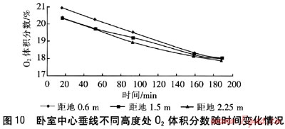 臥室中心垂線上3個(gè)測點(diǎn)中,C0最高體積分?jǐn)?shù)為0.138%,02最低體積分?jǐn)?shù)為17.9%,C02最高體積分?jǐn)?shù)為1.8%,均出現(xiàn)在距地2.25m處的測點(diǎn)上。C0、C02體積分?jǐn)?shù)隨時(shí)間的增加呈上升趨勢,02體積分?jǐn)?shù)隨時(shí)間的增加而下降。在同一垂線,距地面2.25m處的C0、C02體積分?jǐn)?shù)與距地面1.5m和0.6m處較接近,這說明煙氣在垂線位置的體積分?jǐn)?shù)分布已趨于一致。