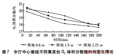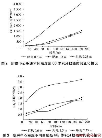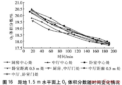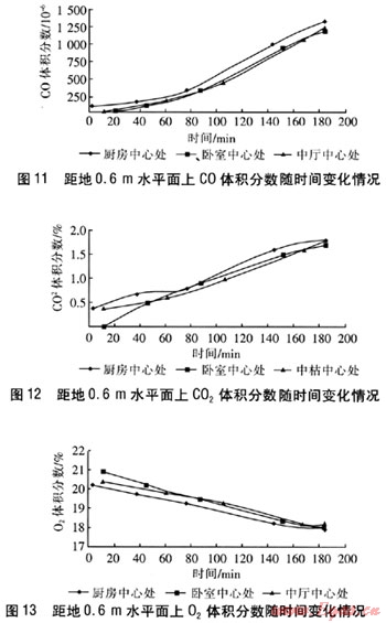在距地面1.5m水平面上共有7個(gè)測點(diǎn),C0最高體積分?jǐn)?shù)為0.157%,位于中廳距窗0.5m處測點(diǎn);02最低體積分?jǐn)?shù)為17.7%,位于中廳距窗0.5m處測點(diǎn);C02最高體積分?jǐn)?shù)為2.0%,位于廚房中心處測點(diǎn)。C0、C02體積分?jǐn)?shù)隨時(shí)間的增加呈上升趨勢,02體積分?jǐn)?shù)隨時(shí)間的增加而下降。在同一水平面上,室內(nèi)各點(diǎn)的C0、C02體積分?jǐn)?shù)較接近。說明在這一水平面上,煙氣的擴(kuò)散速度較快,各點(diǎn)的污染物體積分?jǐn)?shù)較均勻。