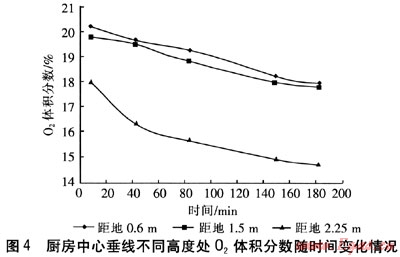 廚房中心垂線上不同高度處的3個(gè)測點(diǎn)中,CO最高體積分?jǐn)?shù)為0.4%,02最低體積分?jǐn)?shù)為14.7%,C02最高體積分?jǐn)?shù)為3.7%,均出現(xiàn)在距地2.25m處的測點(diǎn)上。C0、C02體積分?jǐn)?shù)隨時(shí)間的增加呈上升趨勢,02體積分?jǐn)?shù)隨時(shí)間的增加而下降。這說明隨著燃燒的進(jìn)行,煙氣不斷排放,污染物體積分?jǐn)?shù)逐漸增加,02被不斷消耗。在同一垂線,距地面2.25m處的C0、C02體積分?jǐn)?shù)明顯高于1.5m和0.6m處,這與熱煙氣具有向上浮力和排煙口的位置有關(guān)。