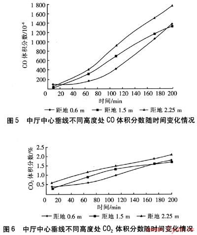 中廳中心垂線上的3個(gè)測點(diǎn)中,C0最高體積分?jǐn)?shù)為0.176%,02最低體積分?jǐn)?shù)為17.6%,C02最高體積分?jǐn)?shù)為2.1%,均出現(xiàn)在距地2.25m處的測點(diǎn)上。中廳C0、C02體積分?jǐn)?shù)隨時(shí)間的增加呈上升趨勢,02體積分?jǐn)?shù)隨時(shí)間的增加而下降。在同一垂線,距地面2.25m處的C0、C02體積分?jǐn)?shù)略高于1.5m和0.6m處,這說明隨煙氣溫度的降低,向上浮力減弱。