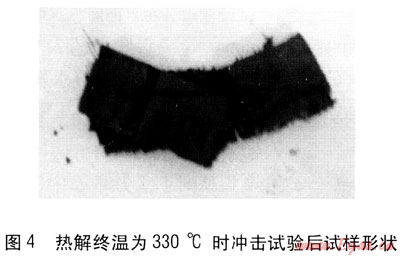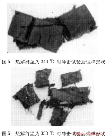 可以看出,隨著熱解終溫的升高,試樣的沖擊韌度逐漸減小。熱解終溫為330℃與340℃時(shí)試樣破碎時(shí)的沖擊韌度沒(méi)有太明顯的變化,在熱解終溫為350℃時(shí)沖擊韌度明顯減小,熱解終溫為360℃時(shí)沖擊韌度減小得更多。熱解終溫為330℃時(shí)沖擊試驗(yàn)后的試樣形狀見(jiàn)圖4,熱解終溫為340℃時(shí)沖擊試驗(yàn)后的試樣形狀見(jiàn)圖5,熱解終溫為350℃時(shí)沖擊試驗(yàn)后的試樣形狀見(jiàn)圖6。