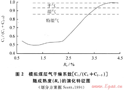 CO2含量和干燥系數(shù)[C1/(C1+C2-5)]是描述煤層氣特征的重要參數(shù),煤層氣組分含量變化會引起這兩個參數(shù)的變化。CO2含量大于10%即被認(rèn)為含量非常高[4]。研究中在不同成熟度階段的CO2含量均要大于這一值,這說明成煤有機質(zhì)的演化過程中CO2始終是非常重要的煤層氣組分。然而,與很多實際的煤層氣藏中CO2的含量相比,研究獲得的CO2在氣體組分中的含量明顯較高。在我國的含煤盆地,煤層氣CO2含量一般小于2%[5]。尤其在煤巖演化程度很高的含煤盆地,CO2在煤層氣中的比重反而較低,例如,我國山西沁水盆地南部煤層氣CO2含量為0.03%~0.17%。造成這種差別的主要原因是:①此次研究中采用實驗條件為封閉體系,其中的CO2總體保持了持續(xù)增長的累計產(chǎn)率特征。除了可能參與的一些化學(xué)反應(yīng)而被消耗之外,其余大部分在實驗的各個階段均被保存下來,增加了在產(chǎn)物氣體中的含量。②在地質(zhì)條件下,CO2易溶解于水而被帶走,從而降低了在煤層氣中的比重。盡管模擬的煤層氣中CO2含量較高,但是其相對含量變化仍然可以反映出在地質(zhì)條件下,如果盆地處于持續(xù)埋深,煤層氣保存條件較好情況下,如果煤階較低的含煤盆地中CO2含量可能較高,而煤階較高則CO2含量可能較低趨勢。