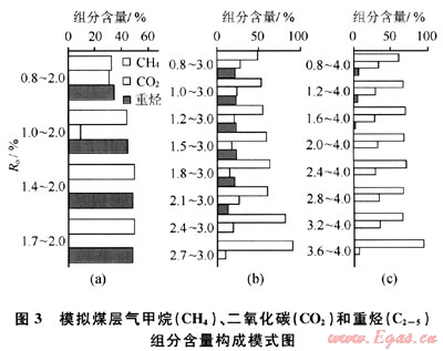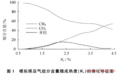 模型表明了演化階段不同則各種煤層氣組分含量的變化情況。煤層氣組分組成與煤的演化階段、成熟度和保存情況密切相關(guān)。成煤有機質(zhì)分別最終演化到Ro最大為2.O%、3.0%和4.O%時煤層氣的組分構(gòu)成不同。例如,當(dāng)Ro=1.0%演化到Ro=2.O%時,煤層氣組成中CH4的含量為45%,CO2為9%,重?zé)N46%;Ro=1.0%演化到Ro=3.0%時,CH4含量為52%,CO2為24%,重?zé)N23%;Ro=1.0%演化到Ro=4.0%時,CH4含量為66%,CO2為29%,重?zé)N5%。由此可見,有機質(zhì)熱成熟演化過程越長,煤層氣組分中烴類氣體CH4含量越高,重?zé)N氣體的含量越低。這一規(guī)律與實際的地質(zhì)環(huán)境中,煤巖演化程度愈高,煤層甲烷的含量越高,重?zé)N含量愈低的情況相符的。而C02基本保持了隨成熟度演化過程增長而含量增大的趨勢。所以,在應(yīng)用煤層氣組分進行煤層氣分類時要考慮這些因素的影響。