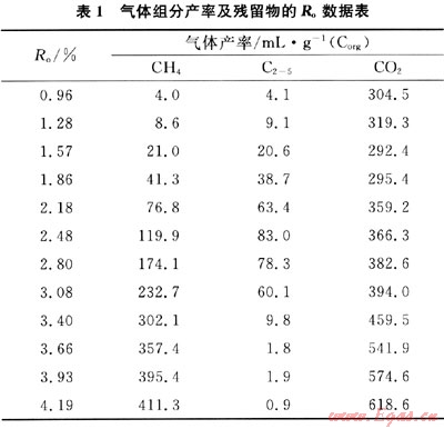 研究采用泥炭進行煤層氣組分及演化的模擬實驗研究。泥炭被認(rèn)為是成煤的原始物質(zhì),基本未經(jīng)歷加熱過程,其中生成煤層氣有機質(zhì)組分保留較為完整。泥炭樣品采自四川省若爾蓋沼澤,采樣深度為3.0~3.2m。實驗在封閉高溫高壓體系和2℃/h升溫速率條件下進行熱解實驗研究,分析的煤層氣組分主要包括CH4、重?zé)N和CO2。獲得的產(chǎn)率和鏡質(zhì)體反射率數(shù)據(jù)如表1。樣品的其他基本分析和實驗方法均見本文參考文獻[3]。
