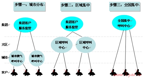 第二步:隨著集團的發(fā)展和對項目公司的影響,在區(qū)域內(nèi)形成統(tǒng)一的服務(wù)流程,從而建立區(qū)域集中式的呼叫中心,預(yù)計時間3-5年;
