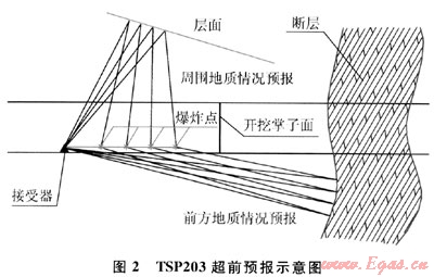 該方法屬于施工過程中的長距離地質預報方法,在宏觀預報的指導下,主要應用TSP 203探測、斷層參數(shù)預測和地面地質體投射等技術手段,對隧道隧洞洞體前方100~150m不良地質體進行長距離超前地質預報。TSP203超前預報示意圖如圖2所示。該方法預報結論相對可靠,30min即可以做好準備工作,測量時間小于90min,操作簡單,對施工干擾小,但其測量出的結果需要采用超前鉆探進行驗證。