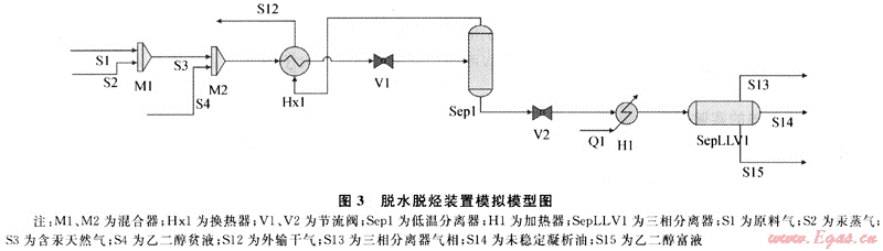 由于低溫分離器等設(shè)備處于脫水脫烴裝置的作業(yè)流程內(nèi)部,不可能在裝置運(yùn)行過(guò)程中實(shí)時(shí)采樣,所以采用VMGSim軟件對(duì)脫水脫烴裝置中汞的分布進(jìn)行模擬(VMGSim軟件是目前國(guó)內(nèi)外唯一能對(duì)微量金屬元素在工業(yè)流程中的分布情況進(jìn)行模擬的專(zhuān)業(yè)軟件)。